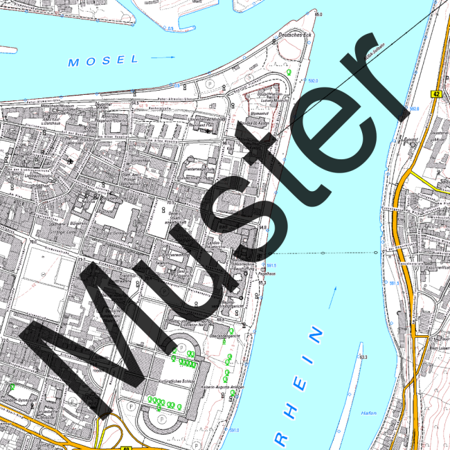 Digitale Topografische Karte von Rheinland-Pfalz im Maßstab 1:5000, Kombination von Topografie und Eigentumsgrenzen.
